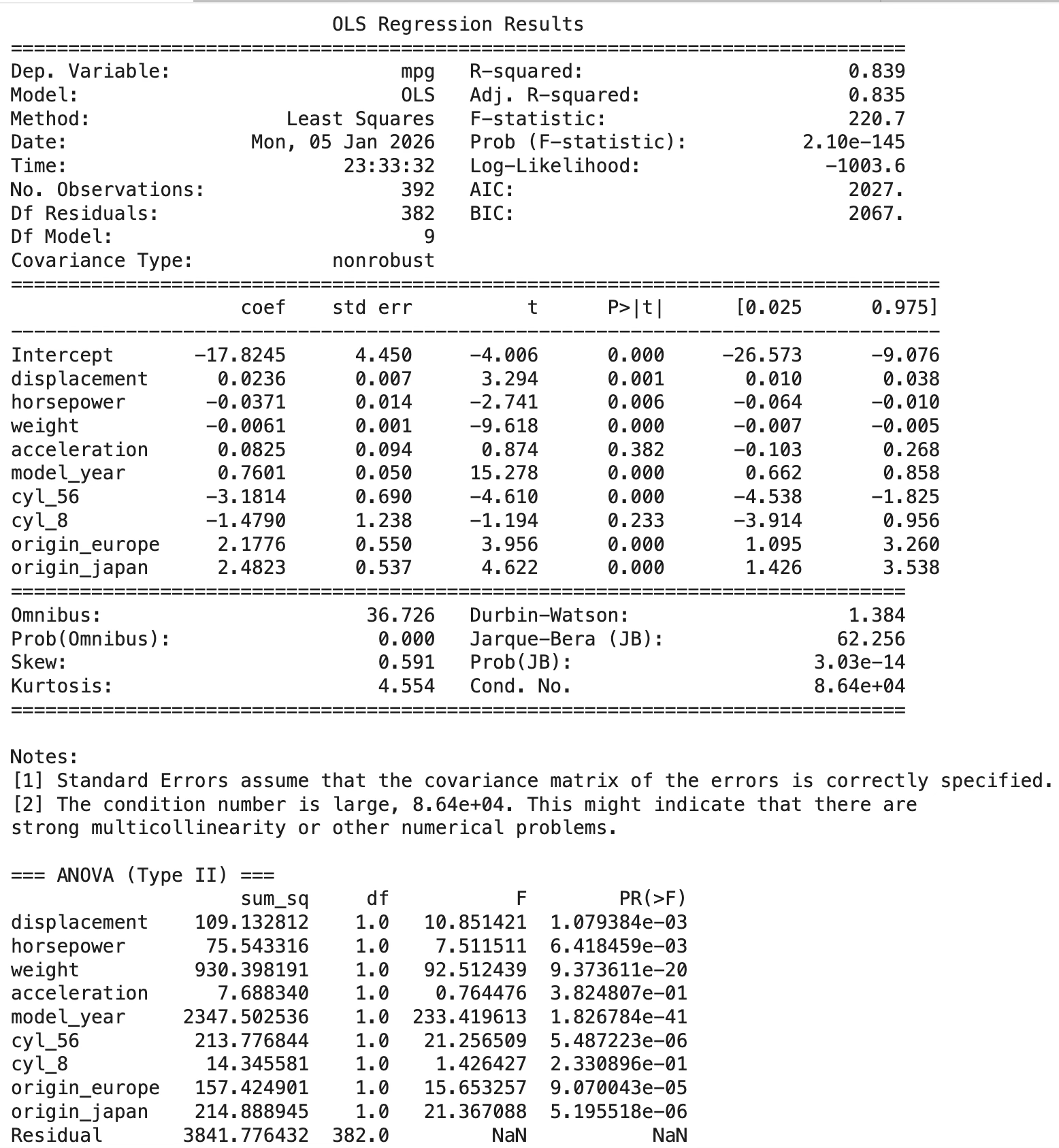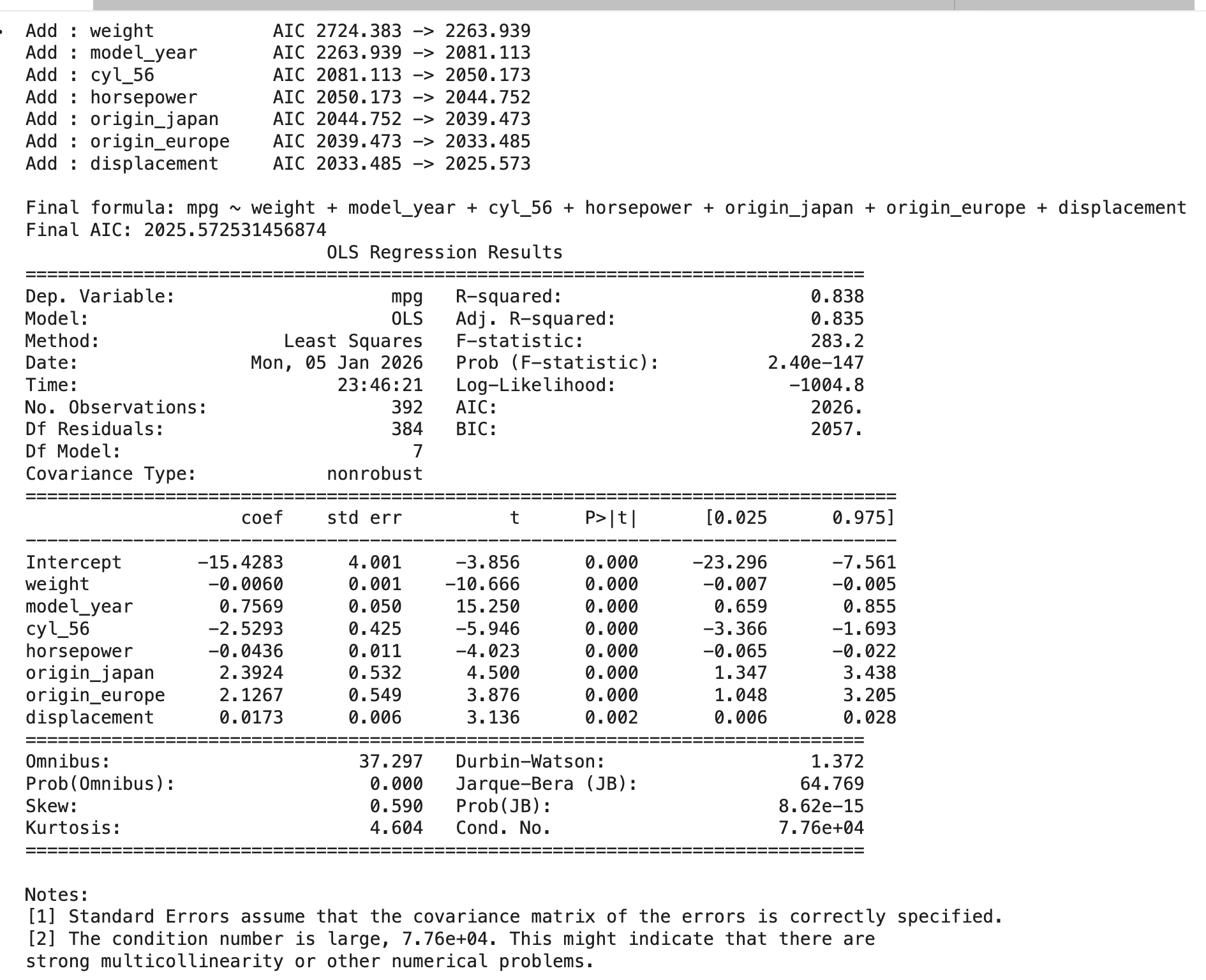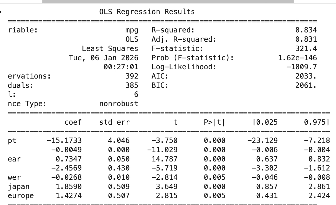 - origin_europe의 계수는 1.4274 이다(p=0.005). 기준 원산지(미국) 대비 유럽 차량의 평균 연비가 약 1.43 높다는 의미이다.