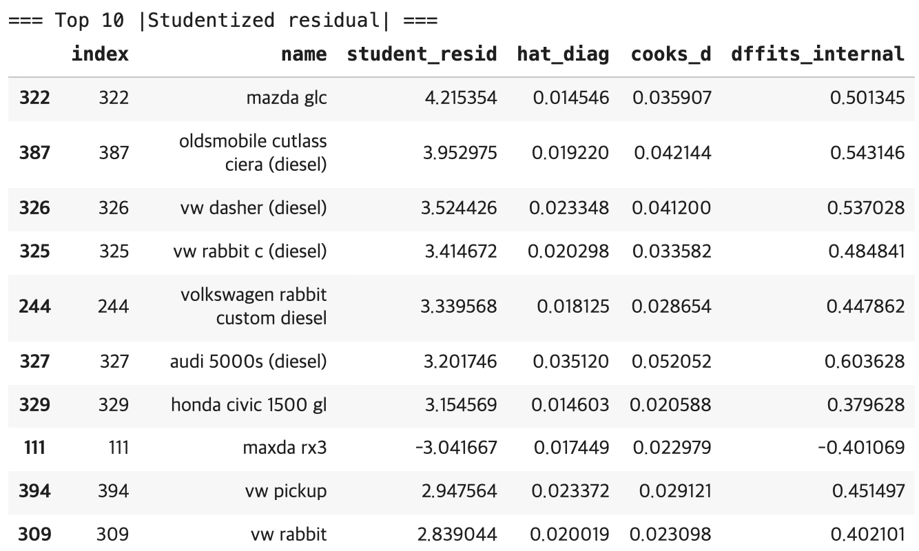상위 10개 중 다수가 \(|student\_ resid| \geq 3\)을 만족한다. mazda glc의 studentized residual이 4.215로 가장 크며, 잔차 관점에서 매우 강한 이상치 후보이다. oldsmobile cutlass ciera (diesel), vw dasher (diesel), vw rabbit c (diesel) 등도 3 이상으로 강한 이상치 후보이다. maxda rx3는 -3.04로 음의 방향 이상치이다(실제 mpg가 모형 예측보다 유의하게 낮게 관측되는 유형이다).