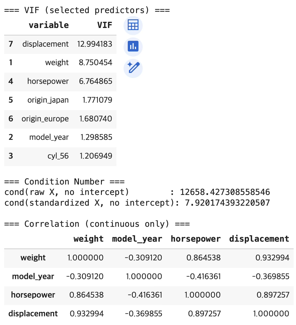 - model_year의 계수는 0.7347 이다(p<0.001). 연식이 1년 증가할수록 평균 mpg가 약 0.735 증가하는 방향이다.