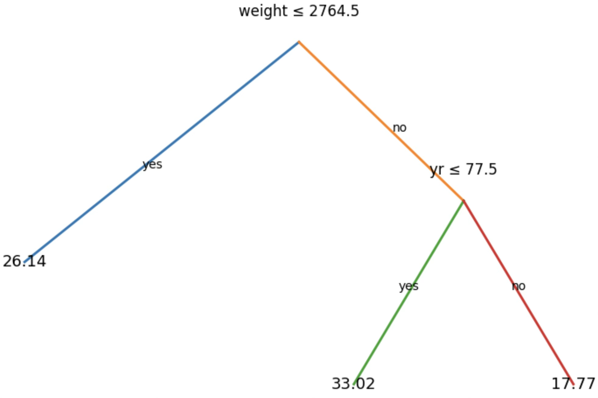 다음 그림은 MPG 데이터에 대해, 자동차의 연비(mpg)를 예측하기 위한 회귀나무이다. 사용된 설명변수는 차량 중량(weight)과 연식(yr, 70–82)이다. 각 내부 노드에서 ”Xj ≤ tk” 형태의 라벨은 해당 분할에서 왼쪽 가지로 내려가는 조건을 의미하며, 오른쪽 가지는 그 조건을 만족하지 않는 경우(즉 Xj > tk)에 해당한다. 예를 들어 맨 위 분할은 weight ≤ 2764.5 여부에 따라 두 개의 큰 가지로 나뉜다. 왼쪽 가지(weight가 가벼운 차량들)에서는 다시 yr ≤ 77.5로 한 번 더 분할되고, 오른쪽 가지(weight가 무거운 차량들)는 그대로 하나의 리프로 끝난다. 이 트리는 두 개의 내부 노드와 세 개의 리프를 가지며, 각 리프에 적힌 숫자는 그 리프에 속한 관측치들의 mpg 평균값을 의미한다.