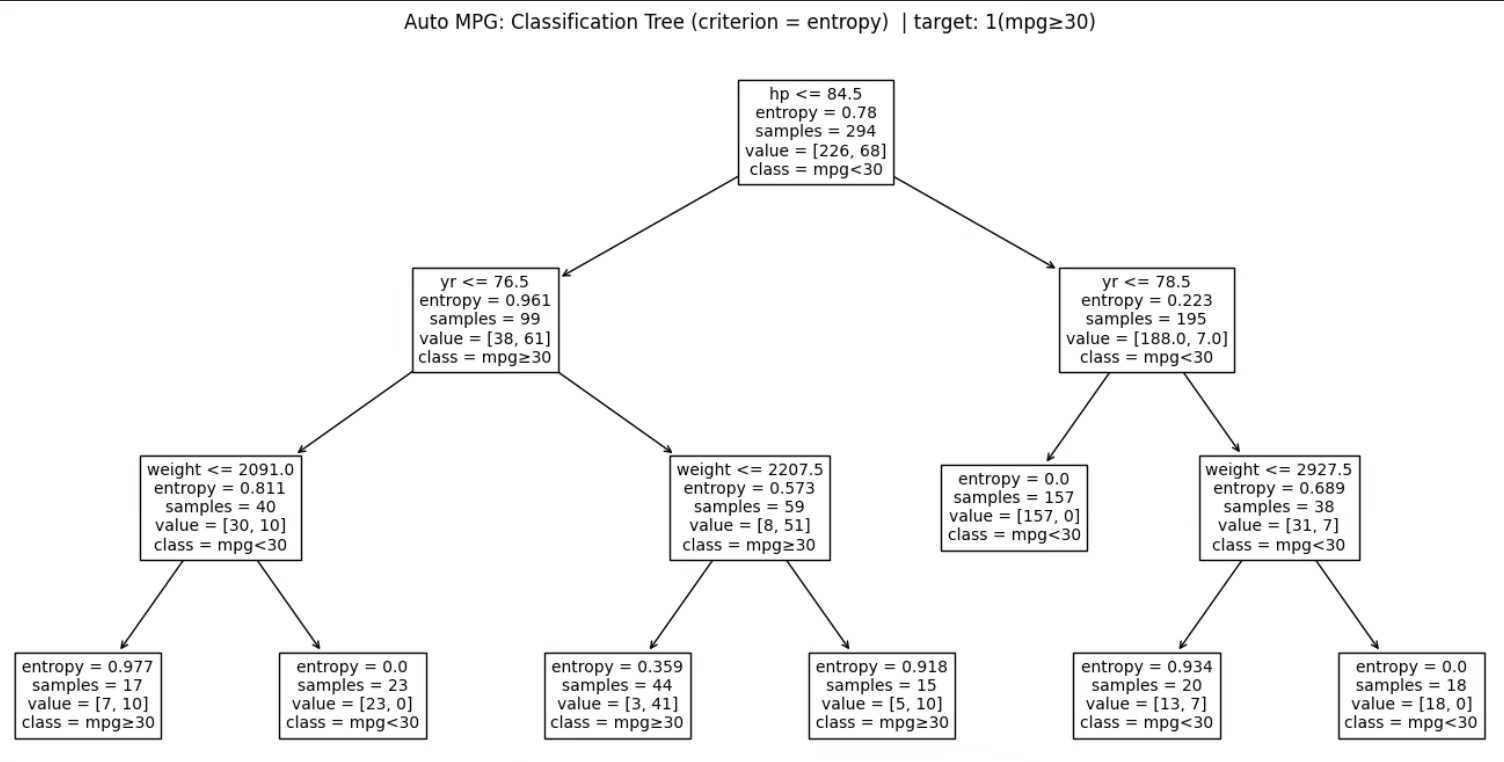 그런데도 분할을 하는 이유는, 예측 클래스가 같더라도 ”순도(node purity)“가 달라지기 때문이다. 예컨대 매우 무거운 구간(>2700)에서는 거의 전부 저연비라 확신이 커지고(지니/엔트로피 감소), 2200~2700 구간은 고연비가 더 섞여 불확실성이 커진다. 그래서 분류오류율은 변하지 않아도 지니/엔트로피가 개선되는 분할이 생길 수 있다.