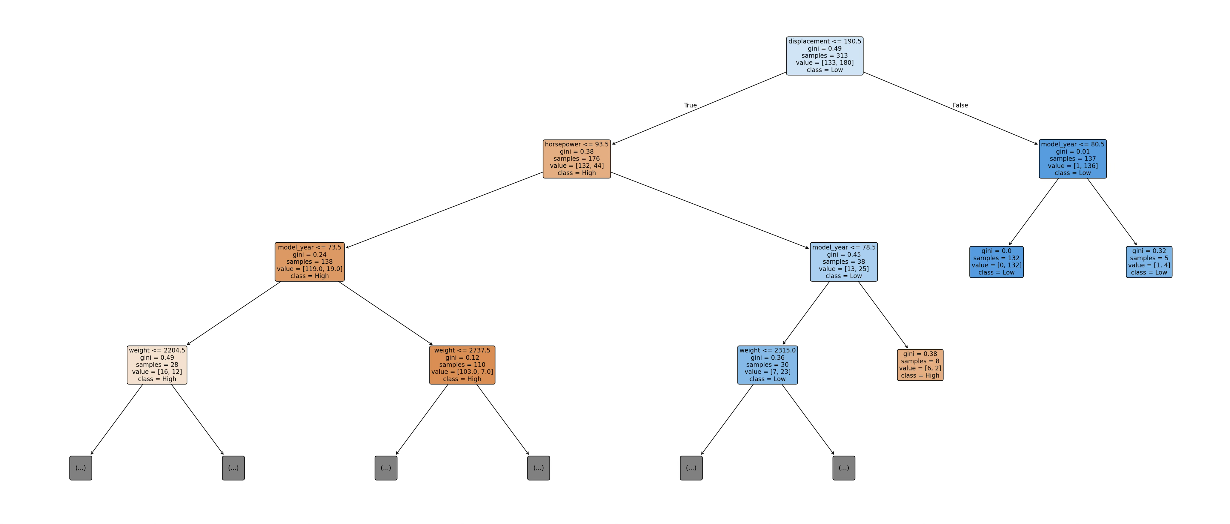 가장 중요한 변수는 배기량(displacement, 0.27)과 차량 중량(weight, 0.27)으로, 두 변수가 거의 동일한 비중으로 전체 설명력의 절반 이상을 차지하고 있다. 이는 연비 수준(High/Low)을 구분하는 데 있어 차량의 물리적 크기와 무게가 가장 핵심적인 판단 기준임을 보여준다.